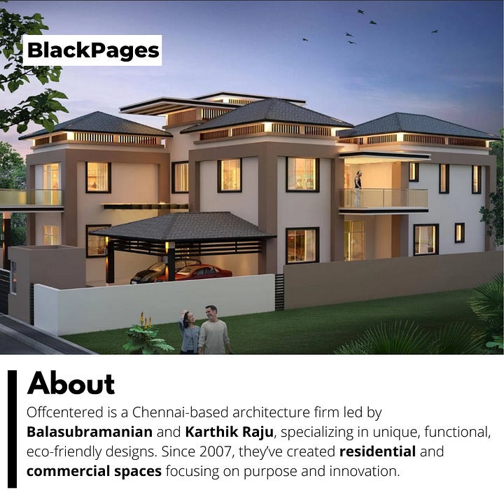 OFFCENTERED Architects and Interior Designers is a partnership firm founded by architects Balasubramanian and Karthik Raju, who have been practicing in Chennai since 2007. With experience across various fields of architecture, the firm offers a comprehensive suite of services including architectural design, planning, project management, space programming, and interior design.
